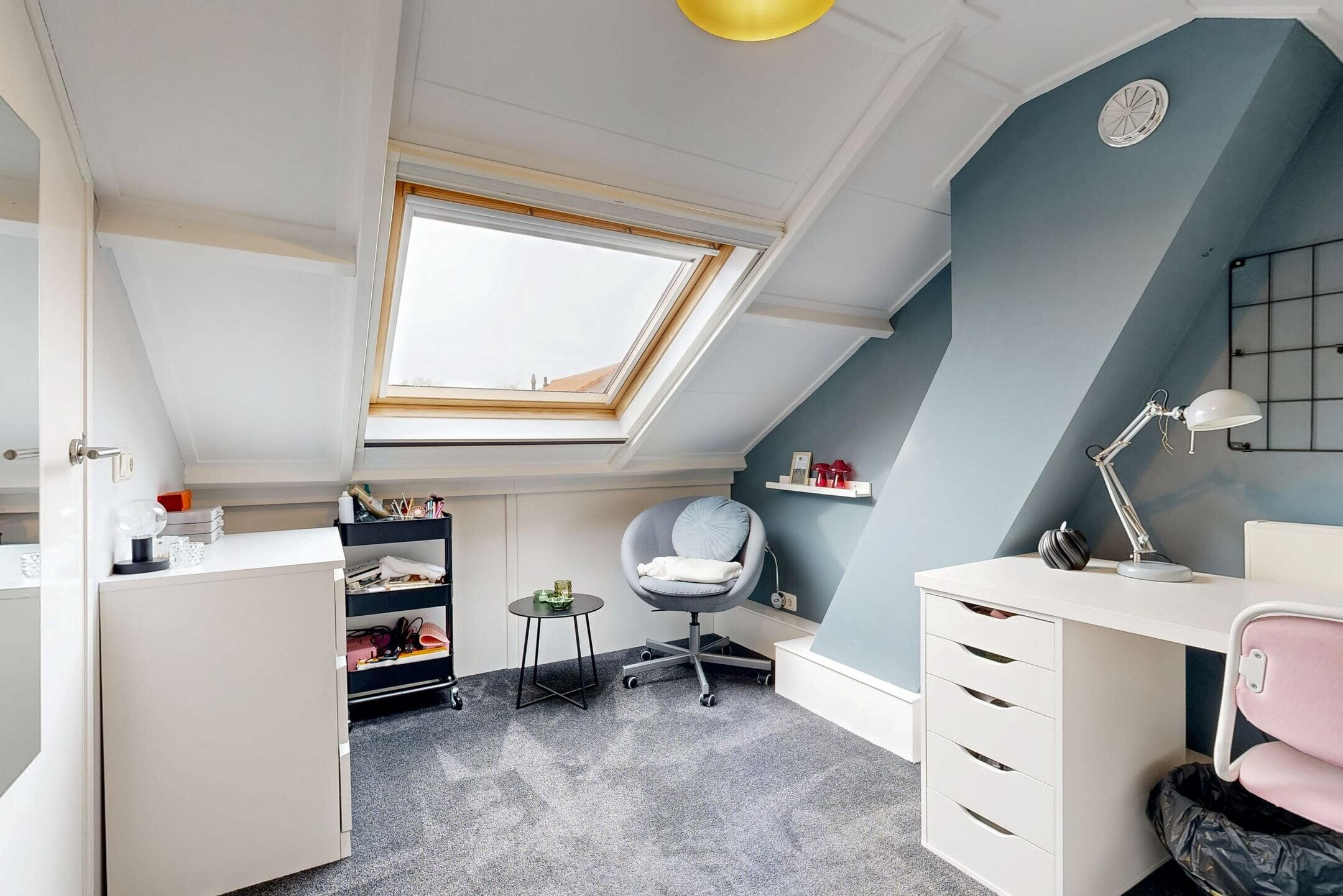 Voorzolder met de witgoedaansluitingen, de CV-installatie (2021), een airconditioning-unit en bergruimte achter de knieschotten. Op deze etage vind je de vierde slaapkamer met Velux-dakraam.