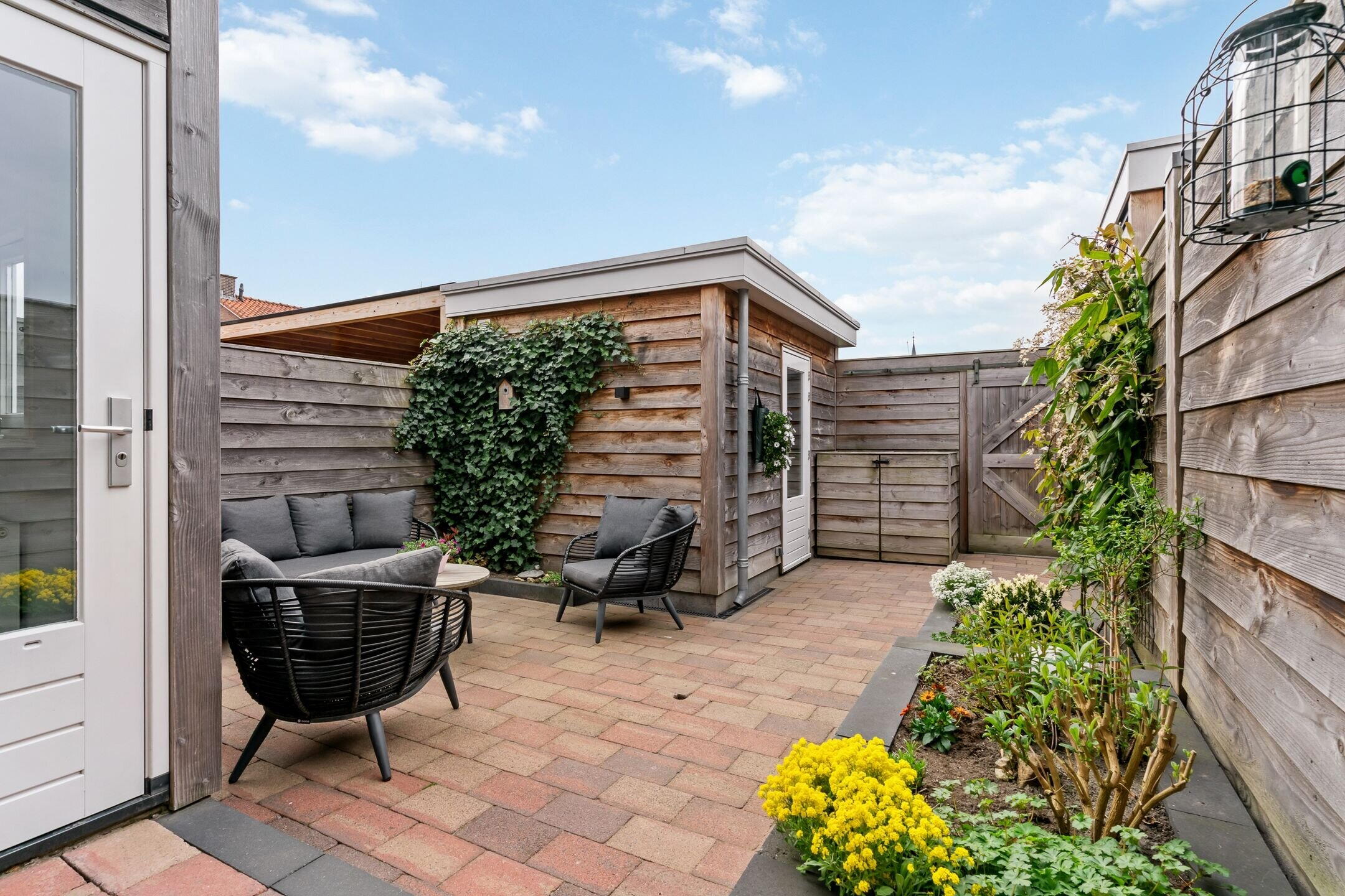 De zonnige achtertuin ligt pal op het zuiden en is in 2021 opnieuw aangelegd waarbij er nieuwe schuur is geplaatst, ideaal voor extra opslag en het stallen van fietsen. Dankzij de gunstige ligging is het hier volop genieten van het buitenleven.