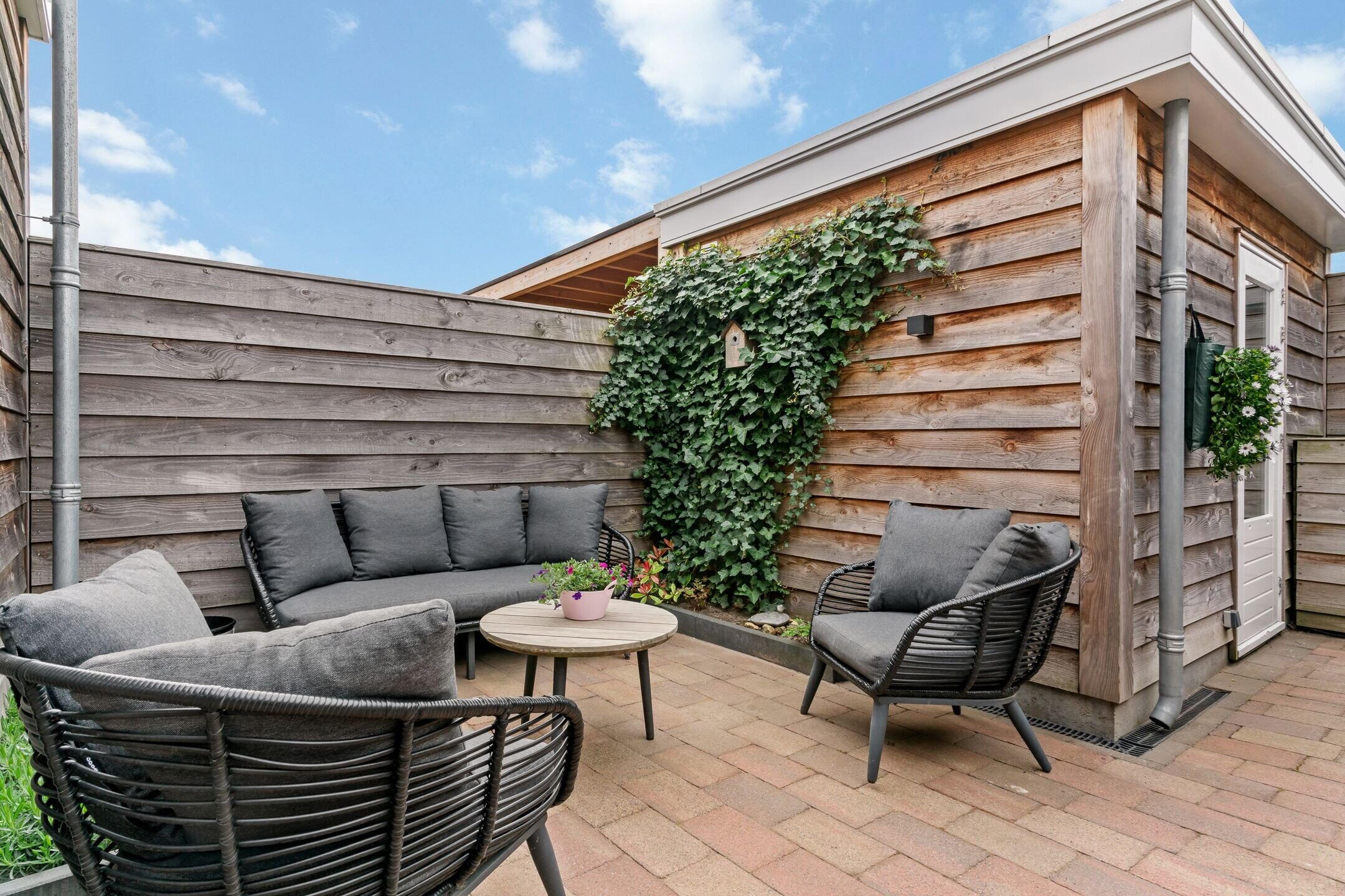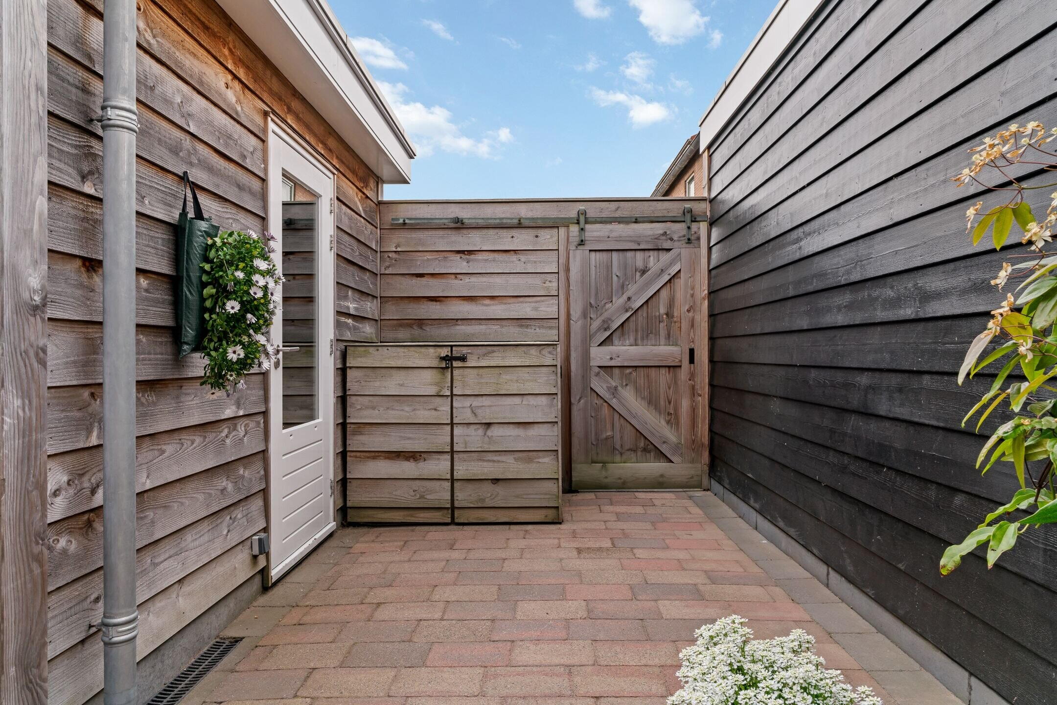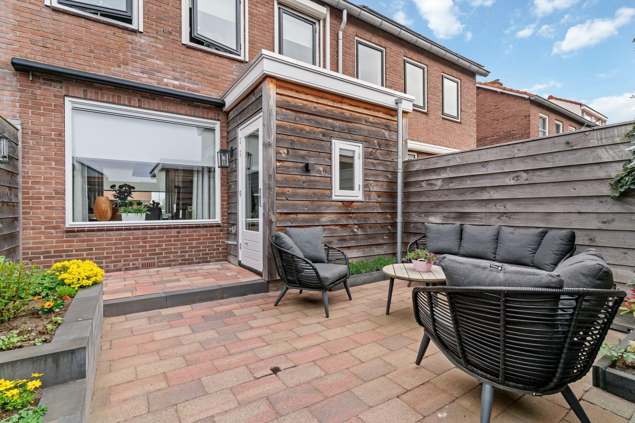 Door de zuidelijke ligging geniet de keurige en in 2021 aangelegde achtertuin de hele dag van optimale zon waar door het elektrische zonnescherm ook een schaduwrijke plek eenvoudig te creëren is. De tuin is grotendeels voorzien van sierbestrating en biedt meerdere plantenborders. Zowel de aanbouw als de schuur, welke ook in 2021 is geplaatst, zijn deels bekleed met luxe en weerbestendig red ceder. Via een barndeur toegang tot de achtergelegen brandgang.
