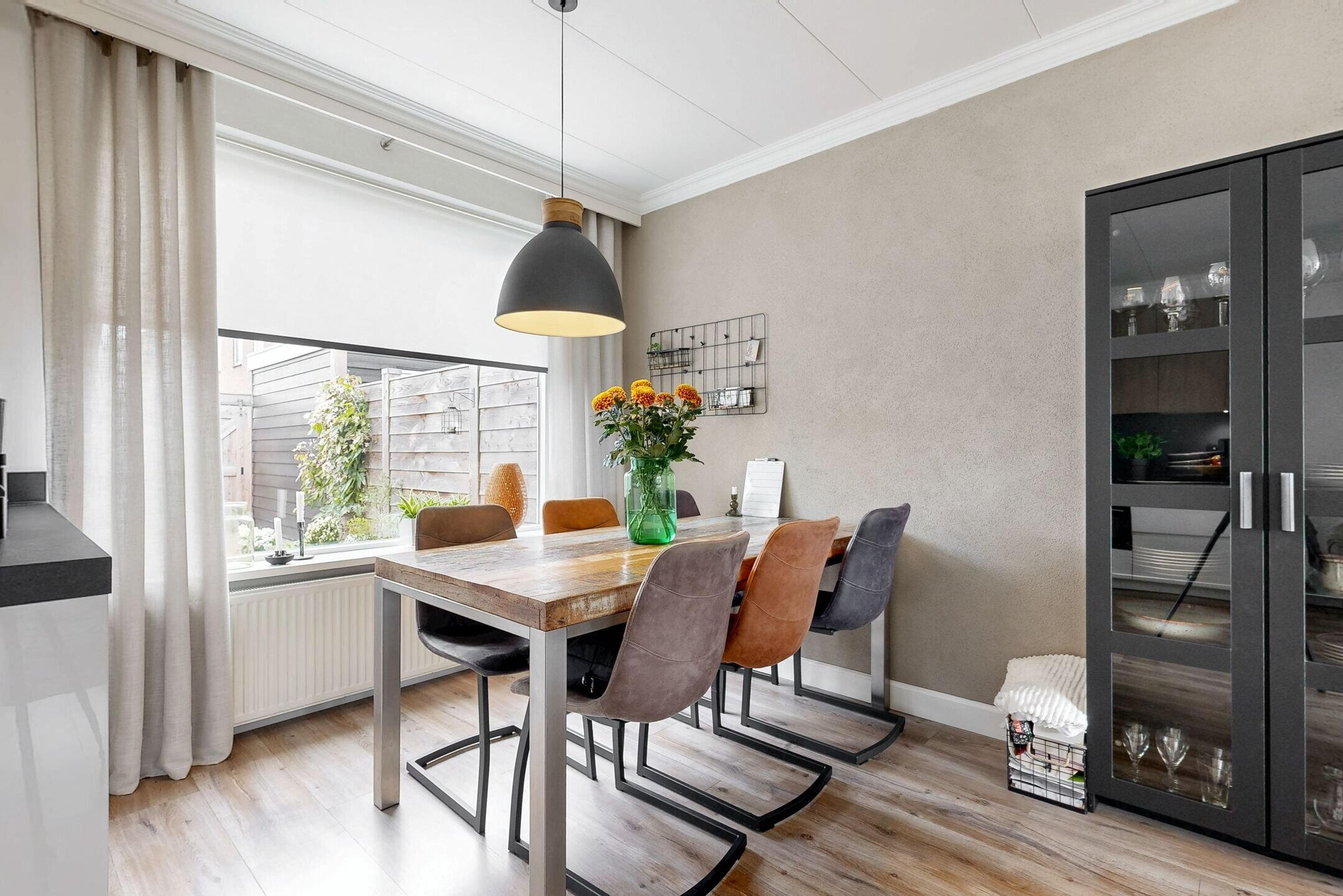 Entree in de hal met de deels betegelde toiletruimte, garderoberuimte, trapopgang en de meterkast. De doorzonwoonkamer is opgedeeld in een zitgedeelte aan de straatzijde en een eetgedeelte nabij de open keuken aan de tuinzijde. De hoge raampartijen zorgen voor een prettig lichtinval. De moderne open keuken met spoeleiland is in 2021 geplaatst en voorzien van alle denkbare gemakken. Zo vind je hier een vaatwasser, inductiekookplaat, combi-oven, Quooker en koelkast. Vanuit hier toegang tot de praktische trap- / kelderkast - ideaal voor proviand en opslag. Ook de bijkeuken is in 2021 aangebouwd en biedt naast de toegang tot de achtertuin een vaste kastenwand.